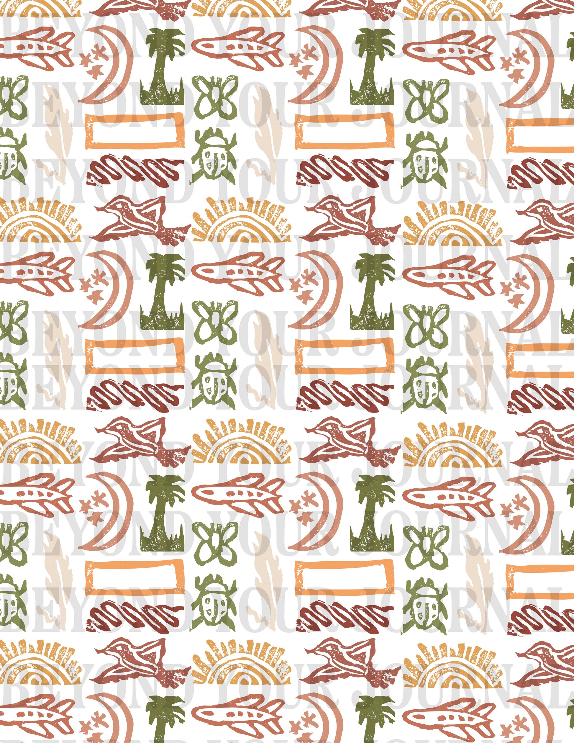 Bring artisan texture and charm to your creative projects with this premium printable paper, designed from a collection of unique hand-carved stamps. Each motif—planes, palms, butterflies, suns, moons, and more, was carefully carved, stamped, and digitized to preserve its bold, rustic character. The result is a one-of-a-kind pattern that carries the warmth of handmade craft.