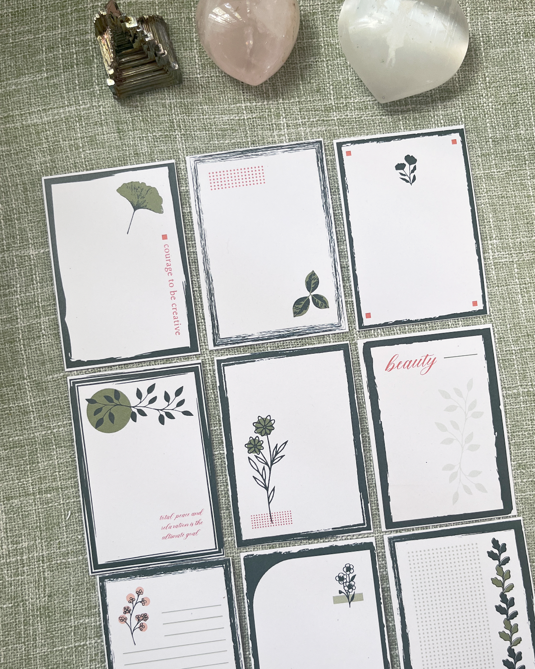 🌻 9 journaling cards featuring floral motifs, quotes, and calm garden tones