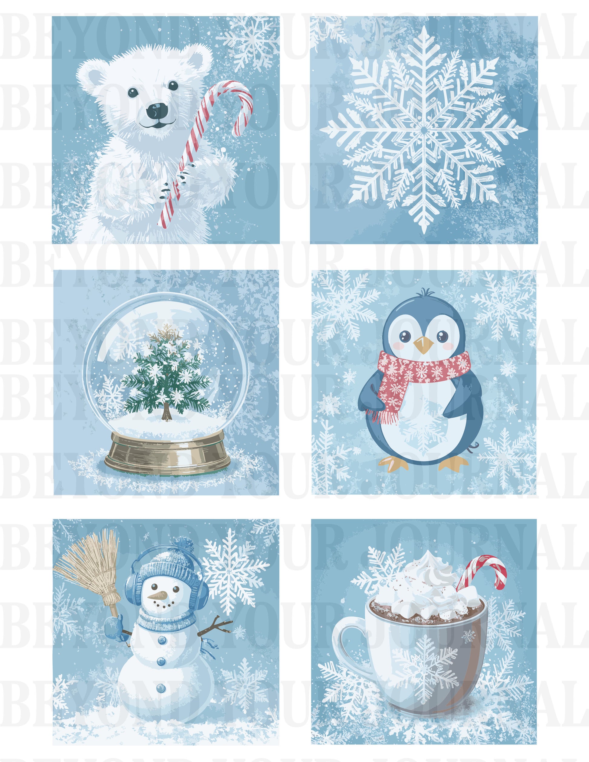 ⛄ Designs include: polar bear with candy cane, sparkling snowflake, snow globe, penguin in a scarf, snowman with earmuffs, and a cocoa mug with candy cane